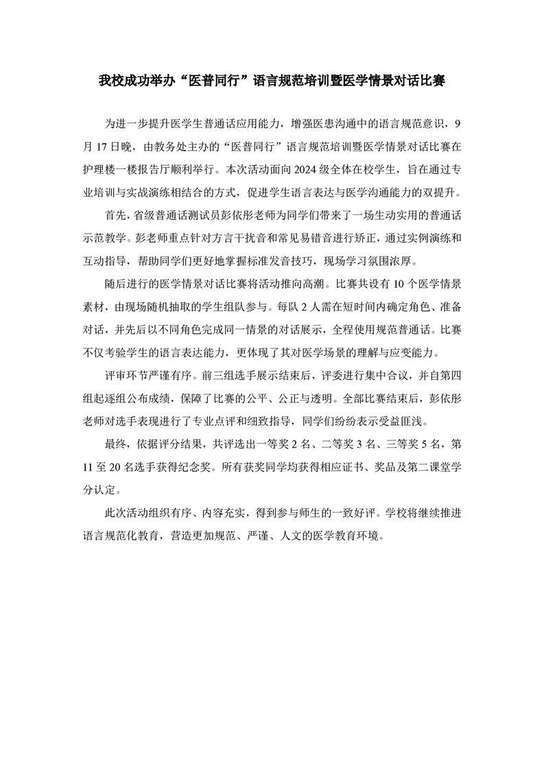 我校成功举办“医普同行”语言规范培训暨医学情景对话比赛