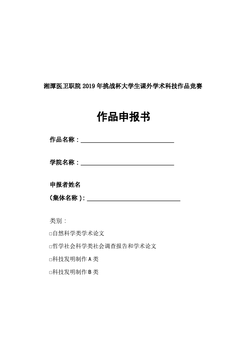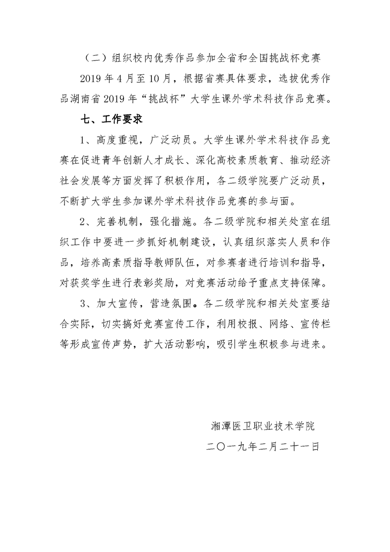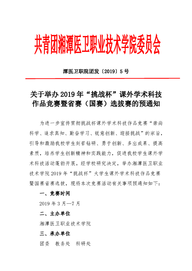 潭医卫职院团发[2019]5号:关于举办2019年“挑战杯”课外学术科技作品竞赛暨省赛(国赛)选拔赛