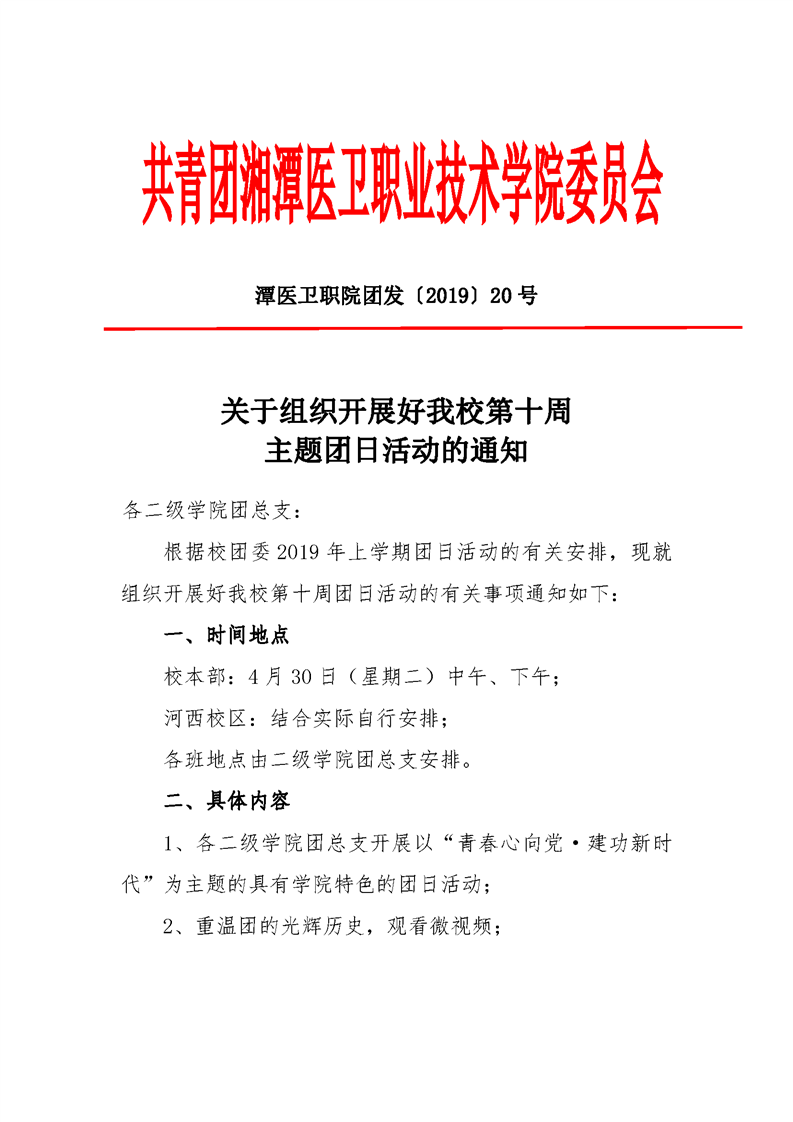 潭医卫职院团发[2019]20号:关于组织开展好我校第十周主题团日活动的通知