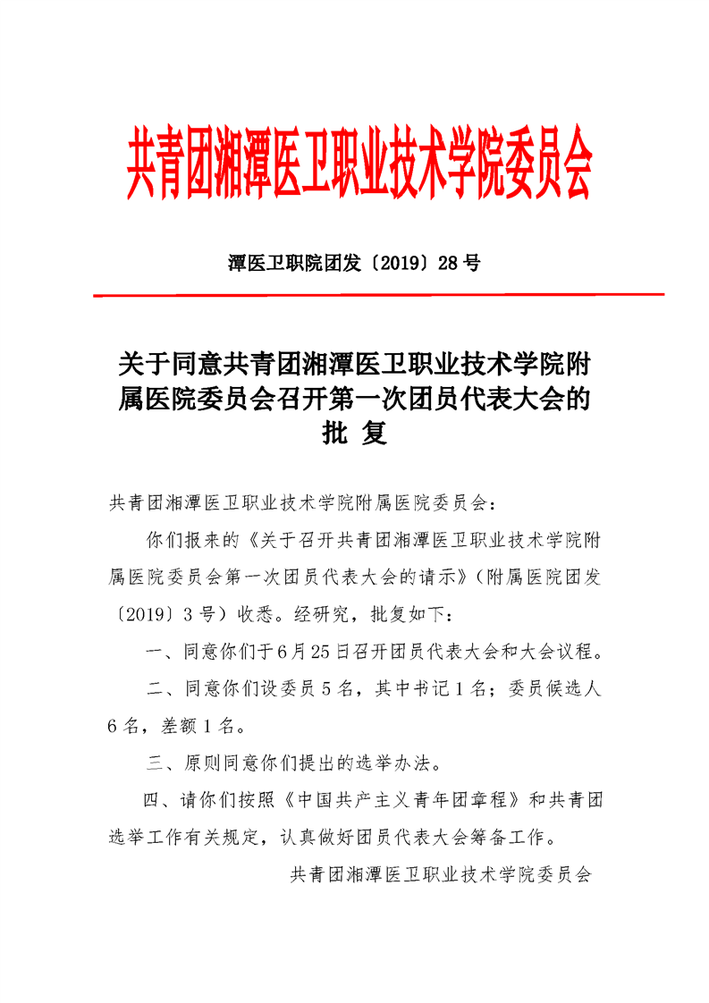 潭医卫职院团发[2019]28号:关于召开共青团华亿(中国)-华亿(中国)附属医院第一次团员代表大会的批复