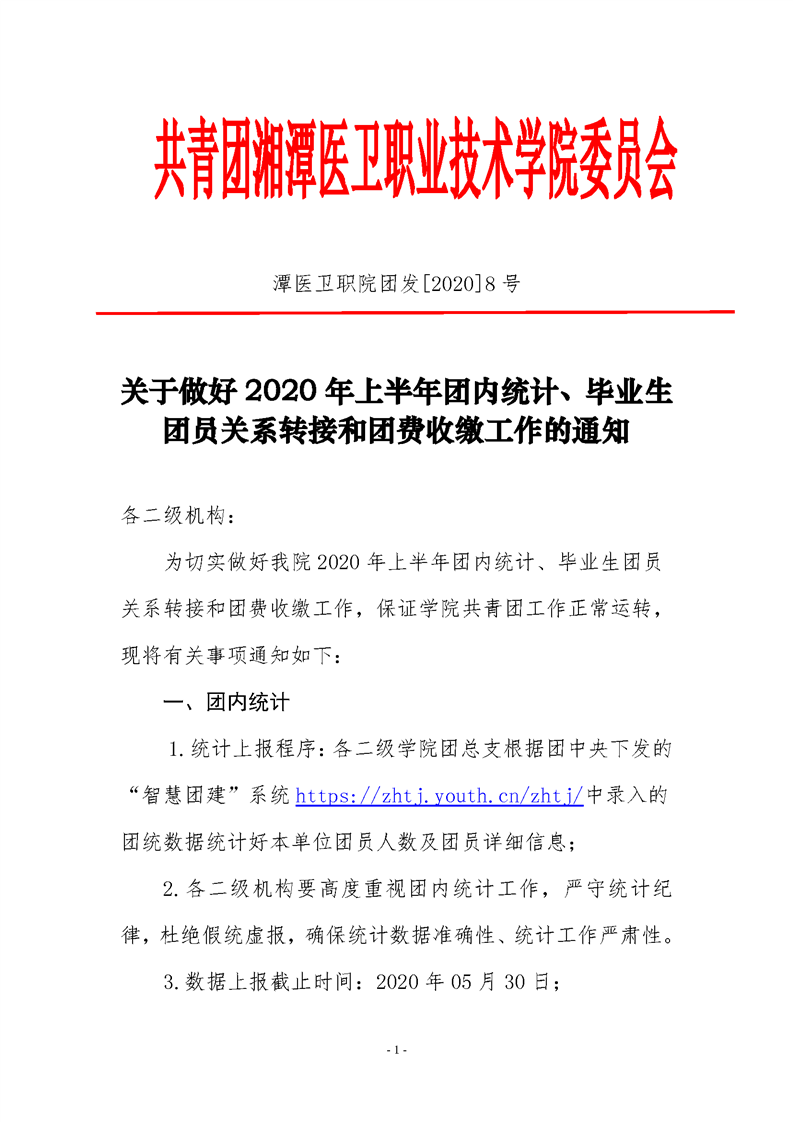 潭医卫职院团发[2020]8号:关于做好2020年上半年团内统计和团费收缴工作的通知