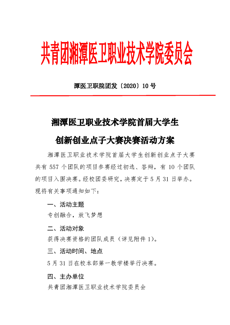 潭医卫职院团发[2020]10号:湘潭医卫首届创新创业点子大赛决赛通知