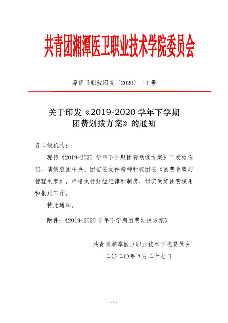 潭医卫职院团发[2020]13 号:关于印发《2019-2020学年下学期团费划拨方案》的通知