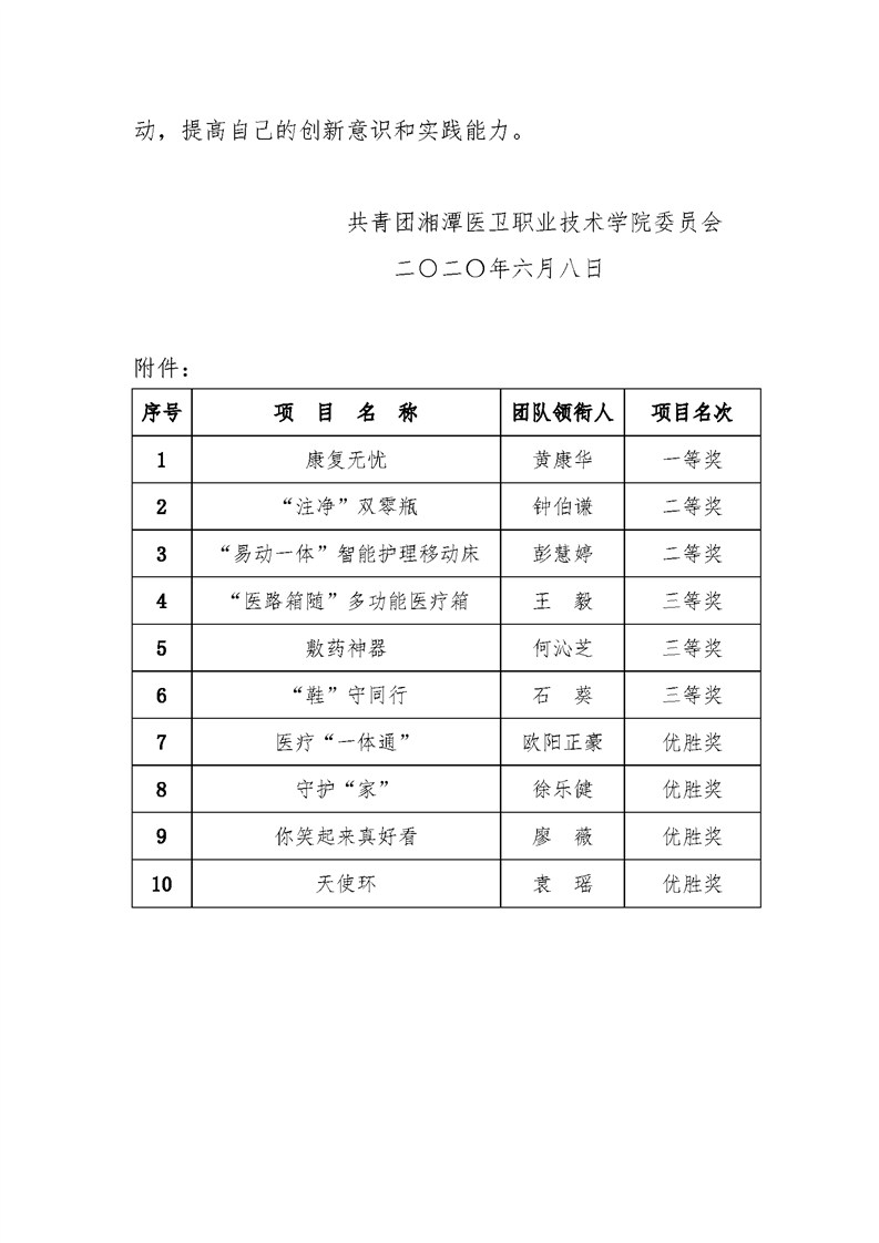 潭医卫职院团发[2020]16号:华亿(中国)-华亿(中国)首届大学生创新创业点子大赛决赛表彰决定