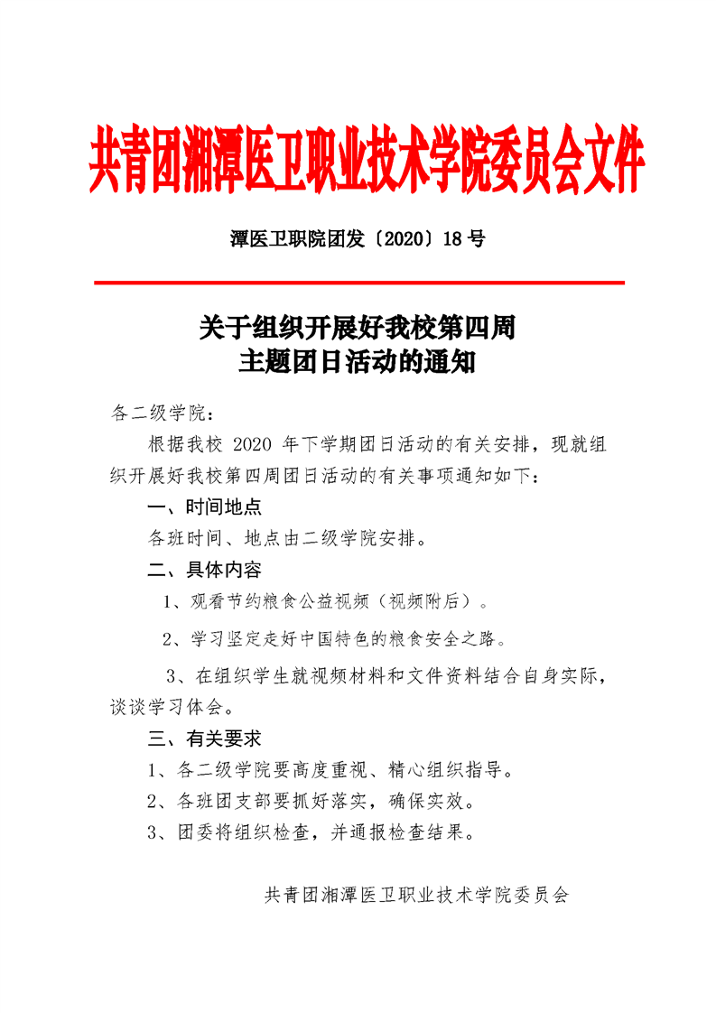 潭医卫职院团发[2020]18号:关于组织开展好我校第四周主题团日活动的通知