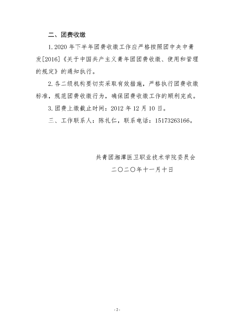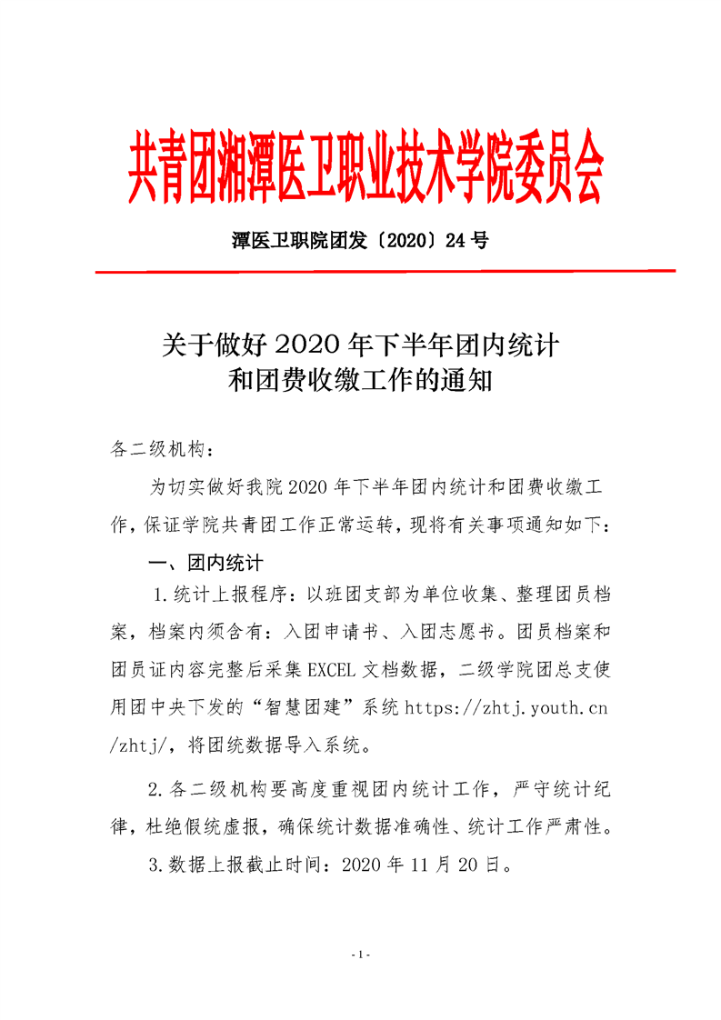 潭医卫职院团发[2020]24号:关于做好2020年下半年团内统计和团费收缴工作的通知