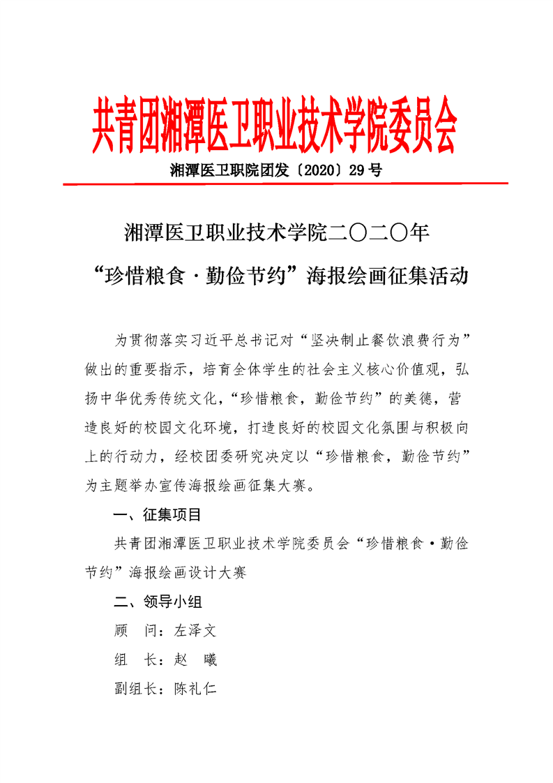 潭医卫职院团发[2020]29号:2020年“珍惜粮食,勤俭节约”海报绘画征集方案
