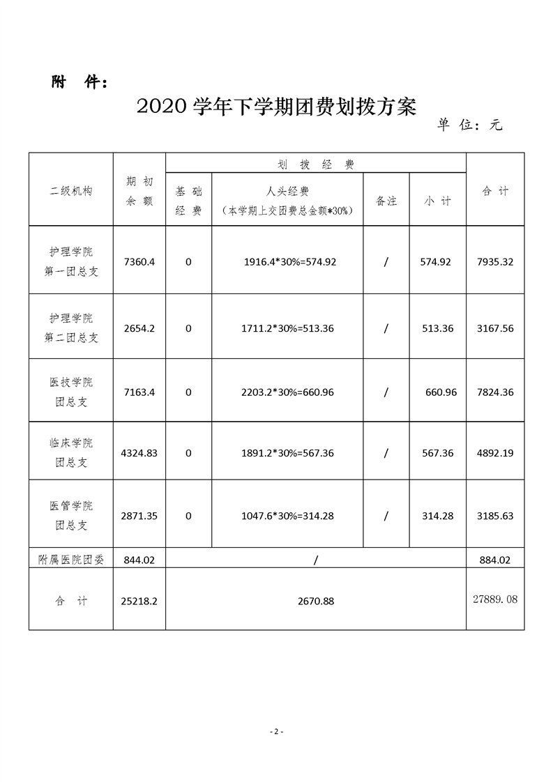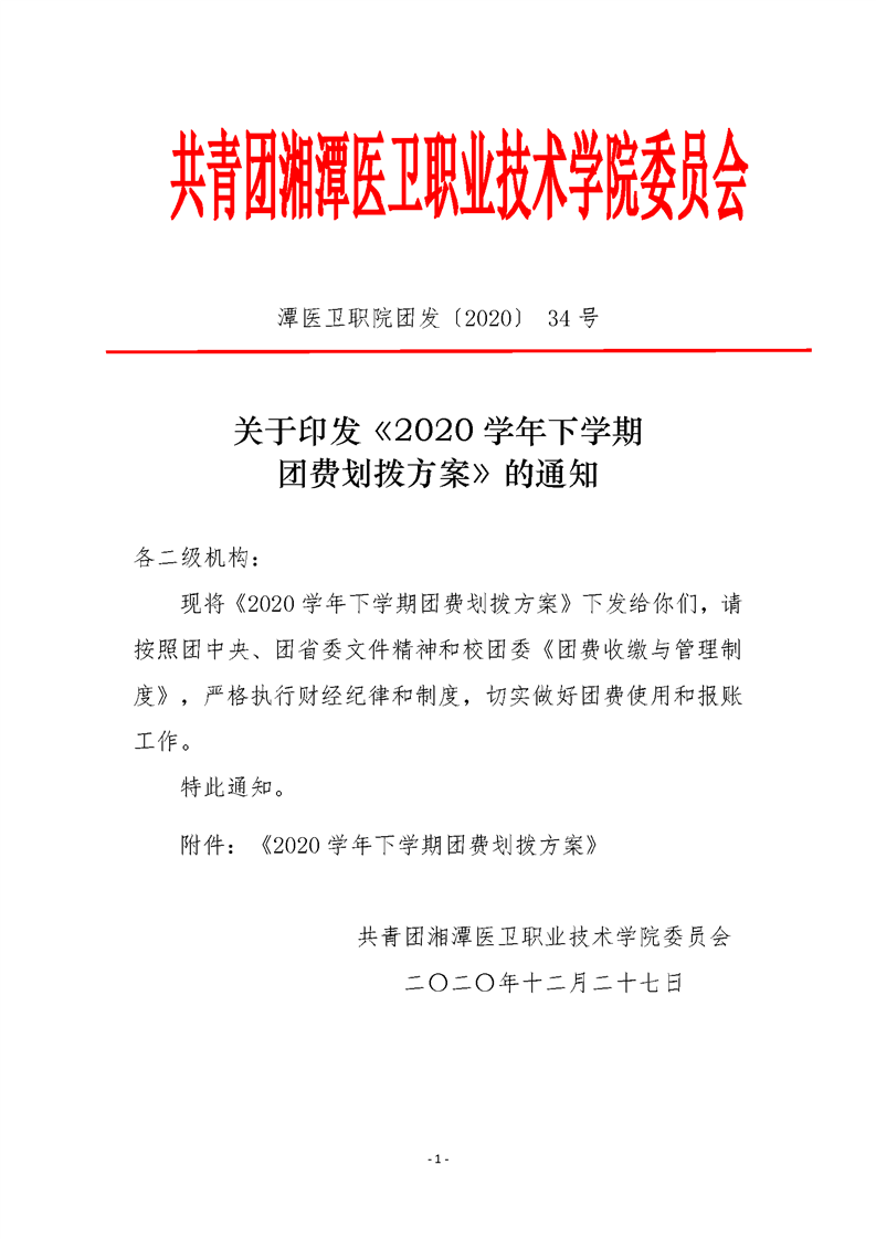 潭医卫职院团发[2020]34号:关于印发《2020学年下学期团费划拨方案》的通知
