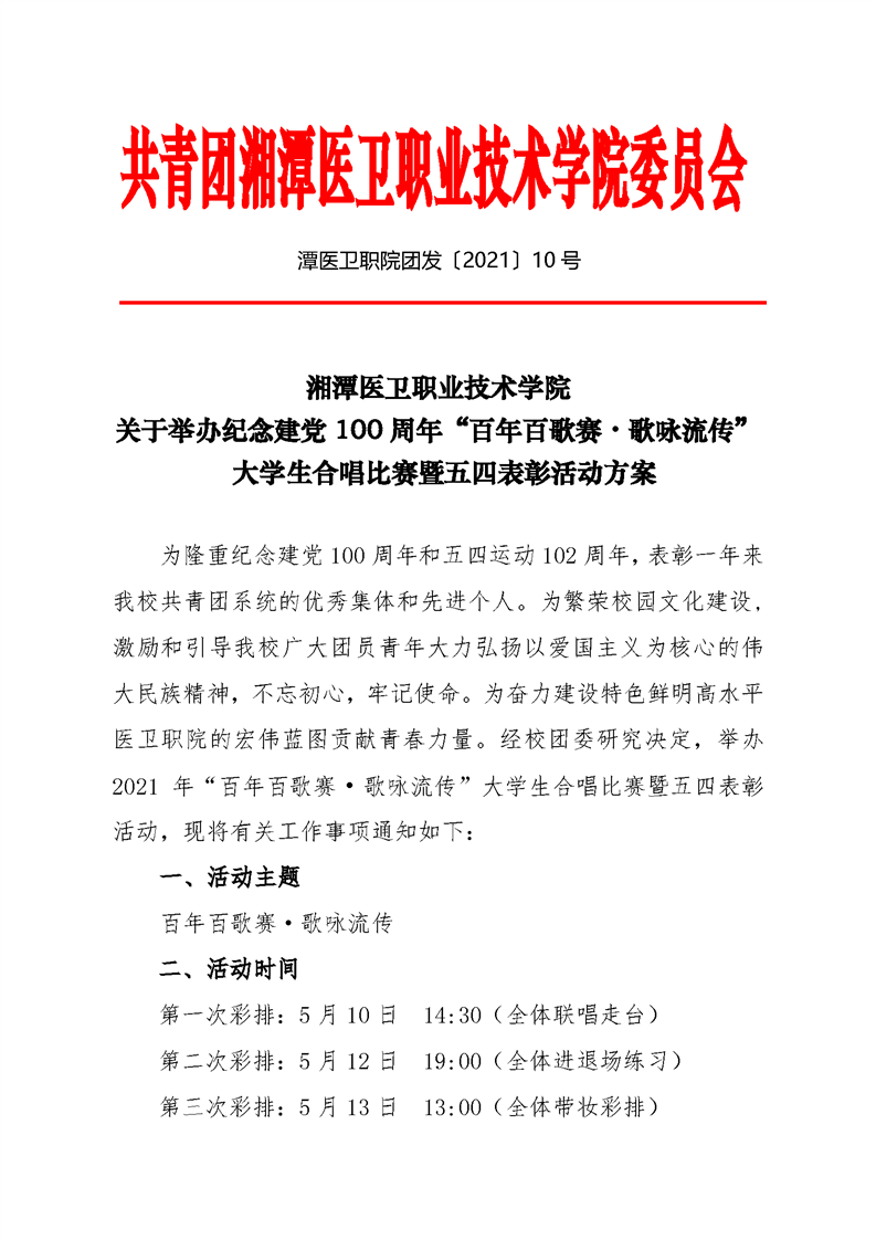 潭医卫职院团发[2021]10号:关于举办纪念建党100周年“百年百歌赛·歌咏流传”大学生合唱比