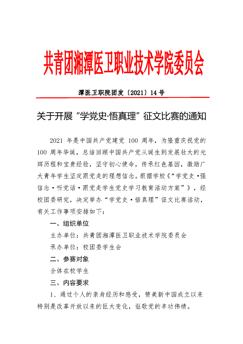 潭医卫职院团发[2021]21号:“学党史·悟真理”征文比赛活动
