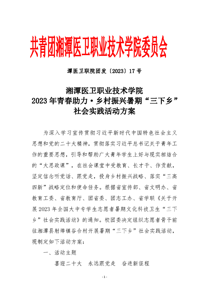潭医卫职院团发[2023]17号:2023年青春助力乡村振兴暑期“三下乡”社会实践活动方案