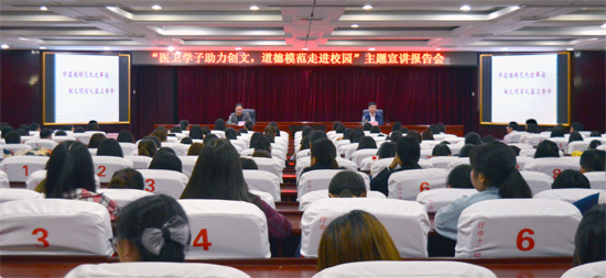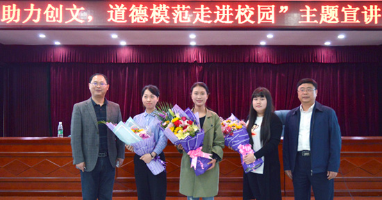 4月18日晚,由校党委宣传部、校团委主办的“医卫学子助力创文,道德模范走进校园”主题宣讲报告会在护理楼一楼报告厅举行。我校优秀毕业生、湘潭市道德模范(提名奖)获得者傅佳圆、龚庆新、“湖南好人榜”候选人方婷应邀前来开讲,她们的优秀事迹让与会的200余名师生代表深受教育。校领导左泽文、杨卫东出席活动。