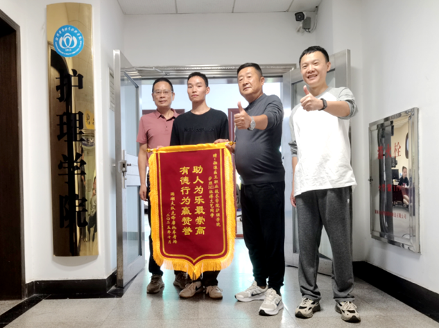 本网讯   近日,我校护理学院收到一面来自湘潭市雨湖区先锋摩托车考场的锦旗,锦旗上“助人为乐最崇高,有德行为赢赞誉”两行金色大字熠熠生辉。这是对护理专业2421班学生傅文艺见义勇为善举的由衷褒奖。