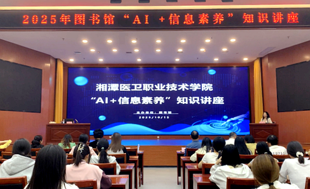 本网讯 10月15日晚,我校信息素养专题讲座暨2025年“AI+信息素养”大赛启动仪式在一报告厅举行,本次活动由校图书馆举办。湖南理工职业技术学院陈扬芳副研究馆员应邀主讲,副校长杨卫东出席,300余名师生参加,现场学习氛围浓厚。